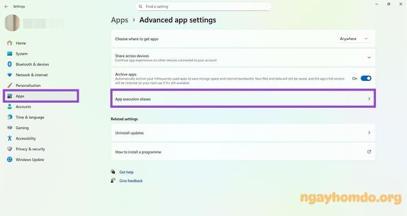 Bước 5. Tìm mục “App execution aliases” và nhấn vào đó. Đây là các tên khác nhau có thể dùng để mở cùng một ứng dụng. Trong trường hợp này, bạn sẽ tắt tính năng này để khi chạy tệp thực thi của Notepad cũ, hệ thống sẽ không tự động tìm kiếm và mở phiên bản Notepad mới thay thế.