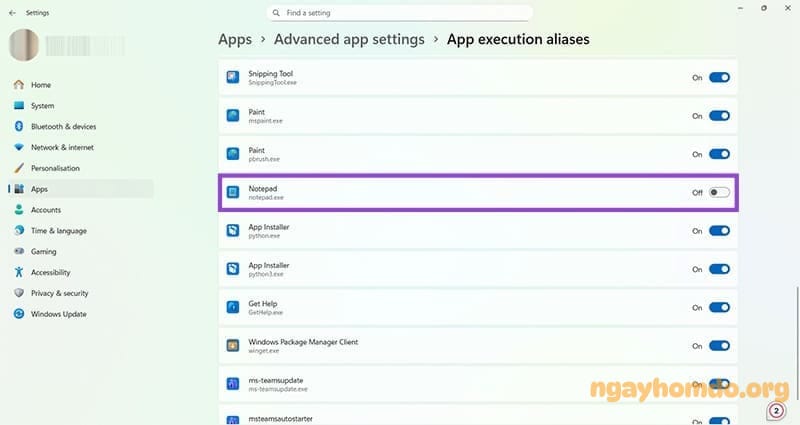 Bước 6. Cuộn xuống danh sách bí danh thực thi ứng dụng cho đến khi thấy Notepad, rồi gạt công tắc sang “Off”.