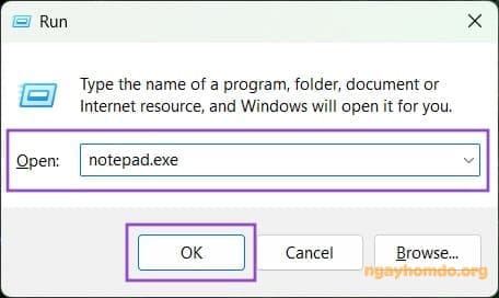Bước 7. Nhấn phím Windows + R cùng nhau để mở cửa sổ Chạy, đây là cách thủ công để mở ứng dụng và các tài nguyên khác. Trong hộp “Open“, hãy nhập “notepad.exe“. Nhấn “OK”.